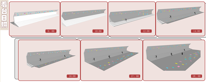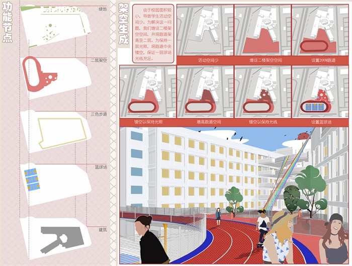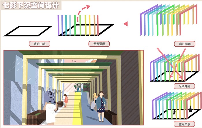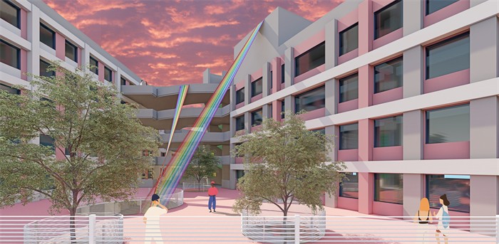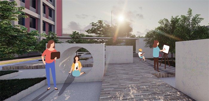 将对学生有着重要意义的彩虹元素运用到设计中,并整体添加现有四色元素,使校园整体风格统一。在校园中设置了多出融入有课堂元素的座椅,将学习生活融入校园景观,使学生将学习带进生活。