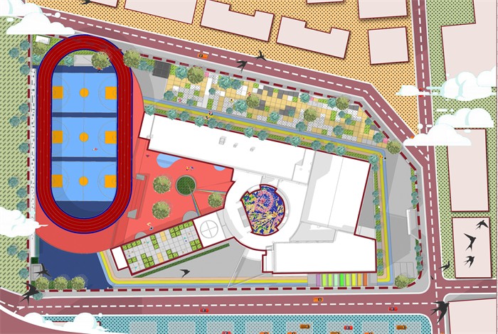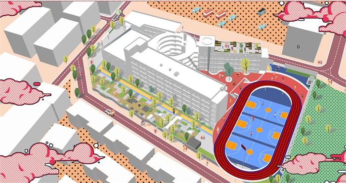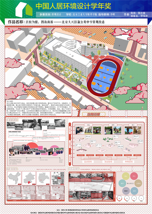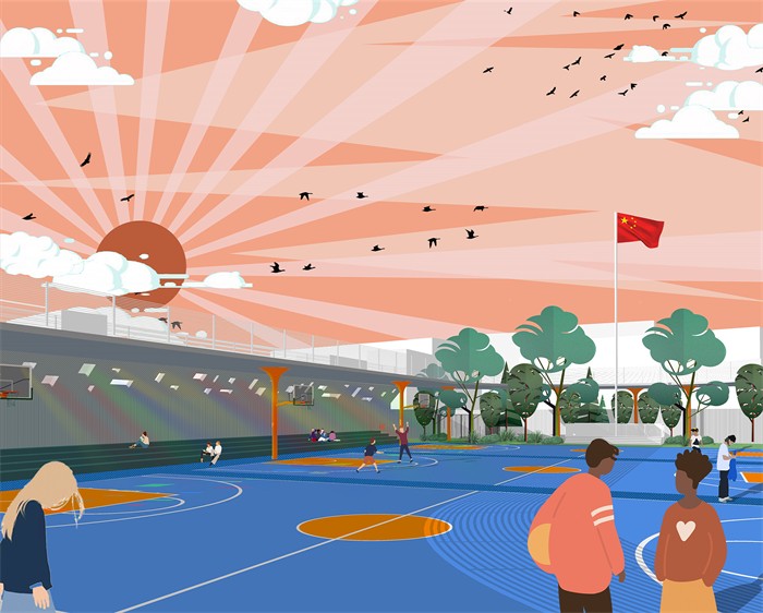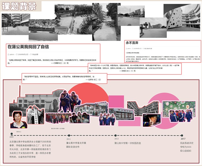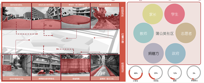 本院获奖设计以蒲公英中学作为选址,旨在改造蒲公英中学现有场地,解决当下空间不足、设施老旧、无美感等问题。蒲公英中学原办学理念为“四海为家,落地生根”,是因为该校生源多为外地务工人员子女,校长希望他们能够在学校落地生根不再漂泊。随着社会的进步,2017年学校搬迁,资金遇到困难,毕业的“小蒲公英们”在得知困难后积极响应,为学校筹款。因此,提出“以校为根,四海而游”的设计概念,以对学校的归属感与亲切感为切入点。