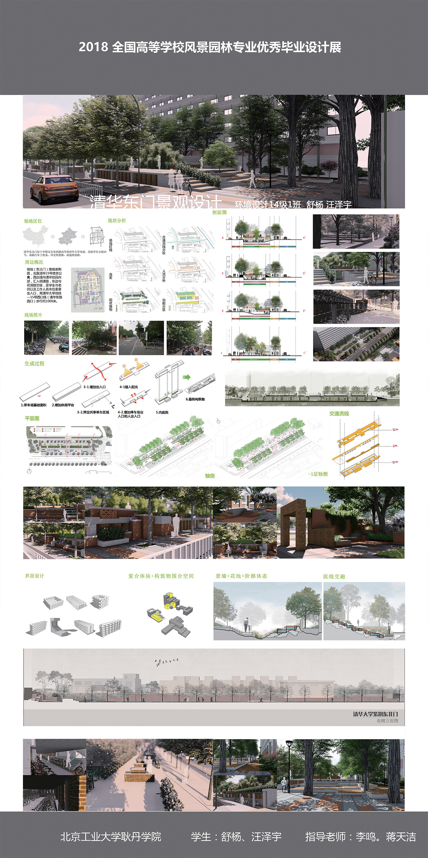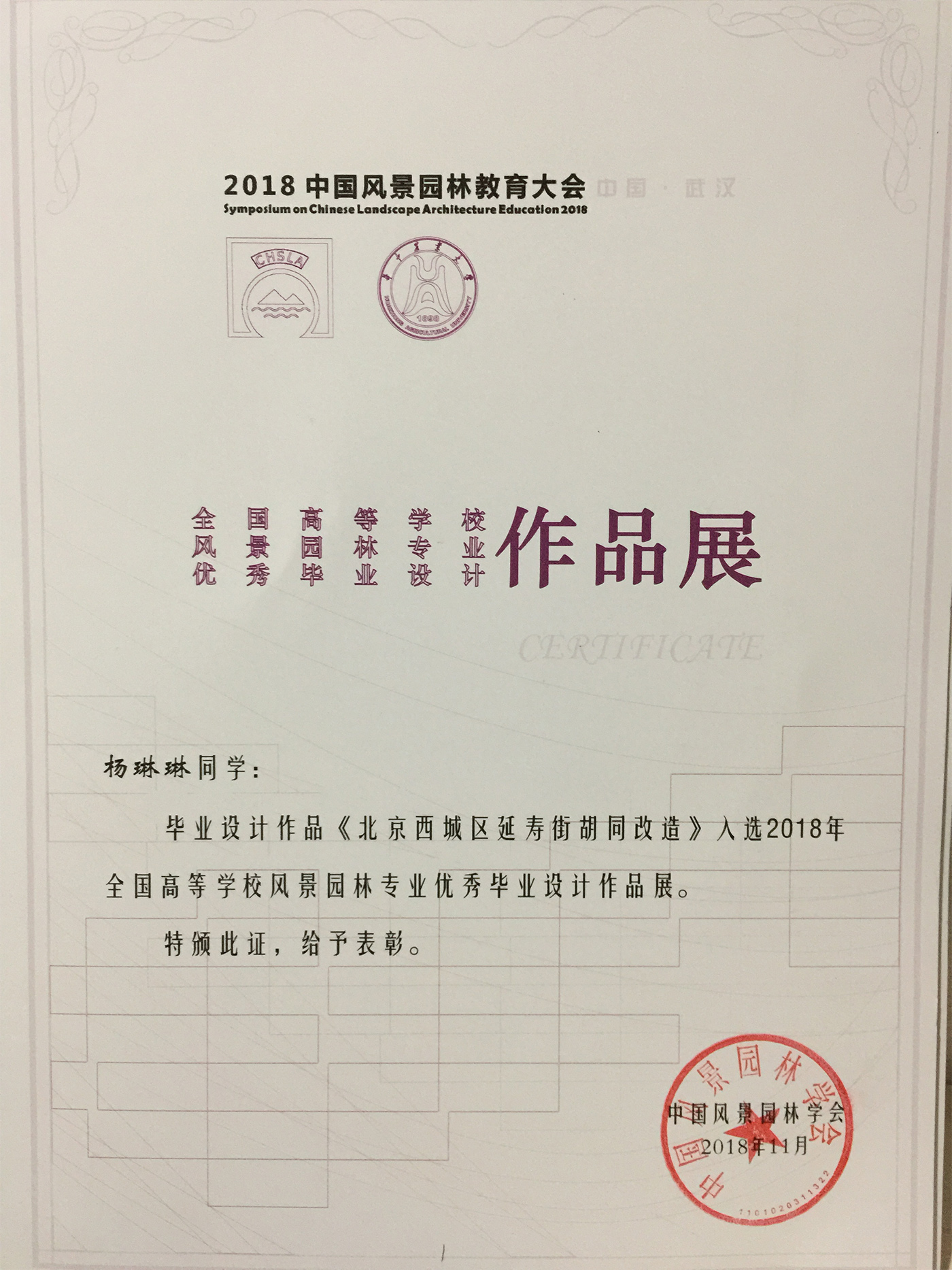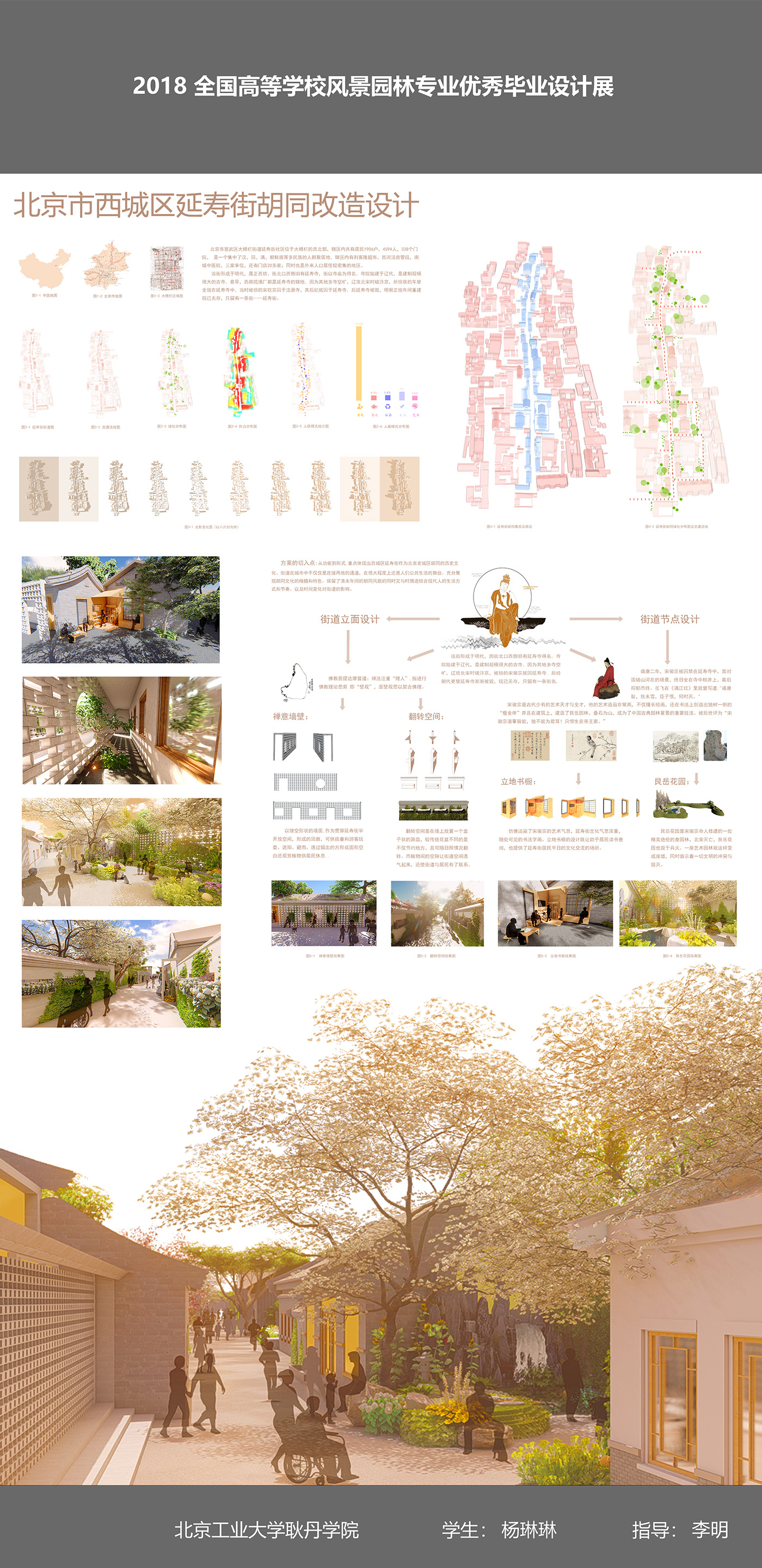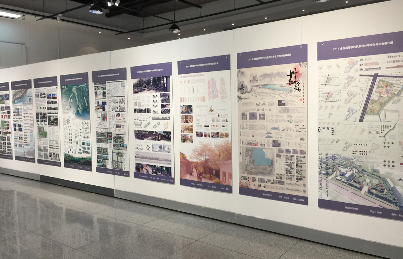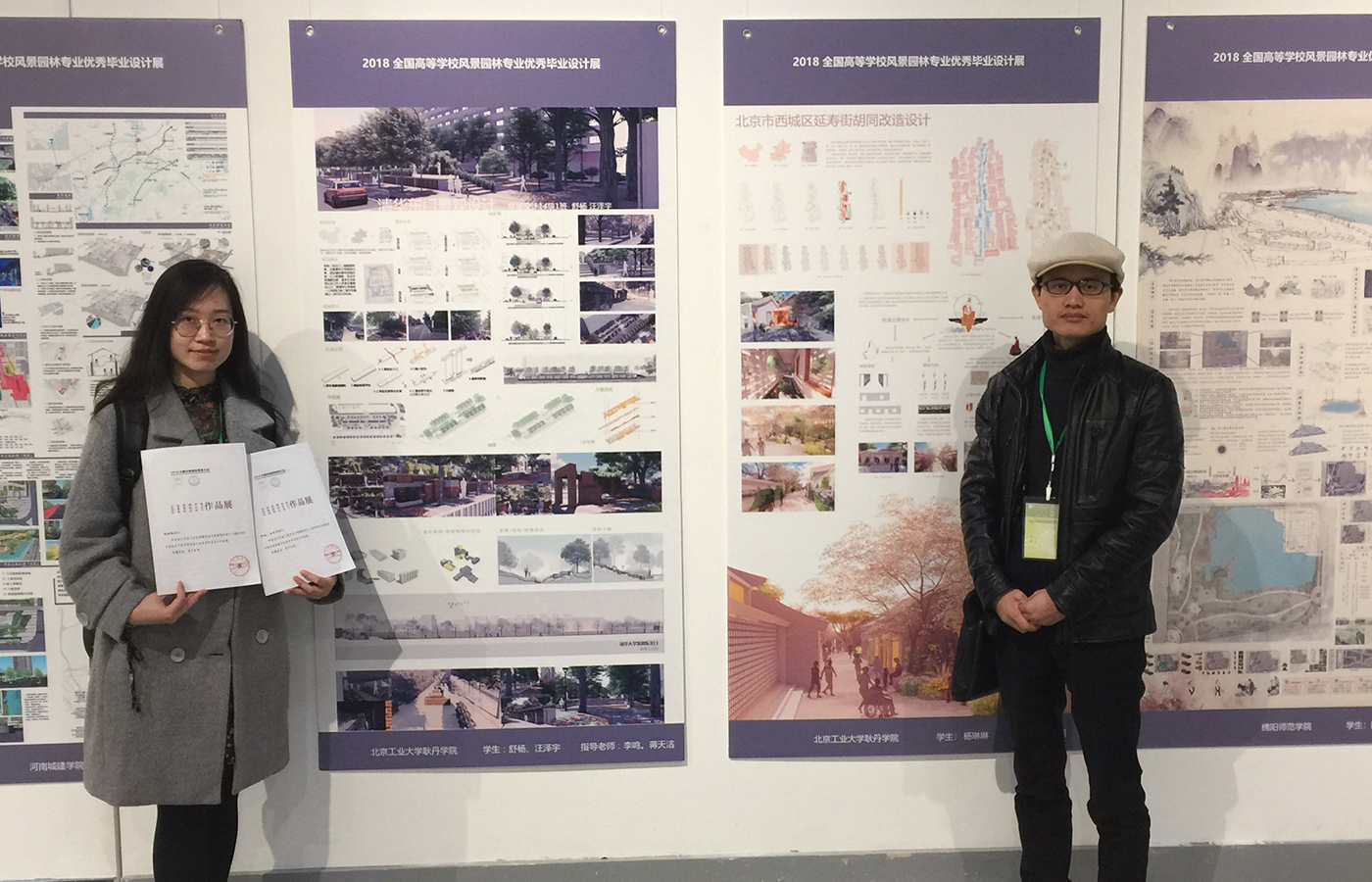 The National Exhibition of Excellent Graduation Design Works of Landscape Architecture was held in the Art Museum of Huazhong Agricultural University. A total of 160 outstanding graduation works from 54 universities in China were selected, which covered “heritage protection”, “planning and design”, “ecological restoration” and “habitat creation”. “Renovation of Yanshou Street Hutong in Xicheng District of Beijing” by Yang Linlin and “Landscape Design of East Gate of Tsinghua” by Wang Zeyu and Shuyang of year 2014 students majoring in environmental design in Gengdan Academy of Design were selected for exhibition.
