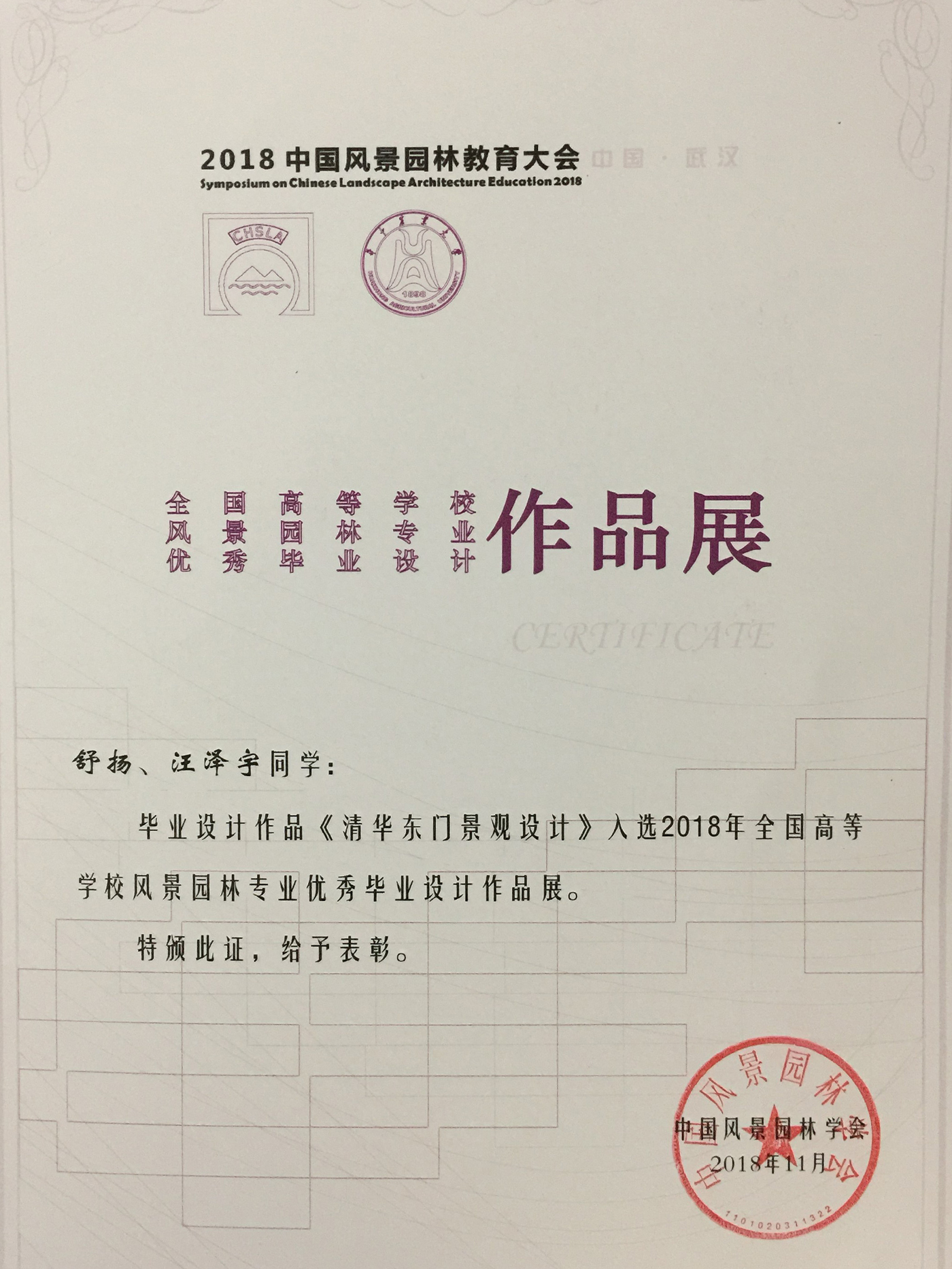 同期在华中农业大学艺术馆举办了全国高等学校风景园林专业优秀毕业设计作品展,共入选了来自全国54所高校的160件优秀毕业作品,内容涉及“遗产保护”“规划设计”“生态修复”“生境营造”等多个方面。365官网环境设计专业14级学生杨琳琳的作品《北京西城区延寿街胡同改造》和汪泽宇、舒扬的作品《清华东门景观设计》入选作品展。