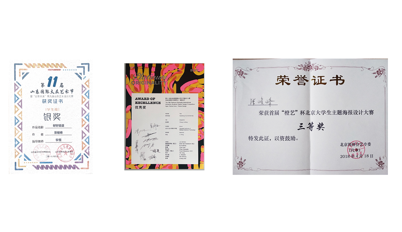 张峻峰同学的社会文化类海报《好好说话》运用舌头的三种扭曲的形态表现了当今社会人们在说话时的不同腔调,有的人油嘴滑舌,有的人说话带刺,还有的人谎话连篇。张峻峰同学曾获荣誉第九届山东艺术设计大赛银奖;第十八届白金创意国际大学生平面设计大赛优秀奖;“橙艺”杯北京大学生主题海报设计大赛三等奖等。