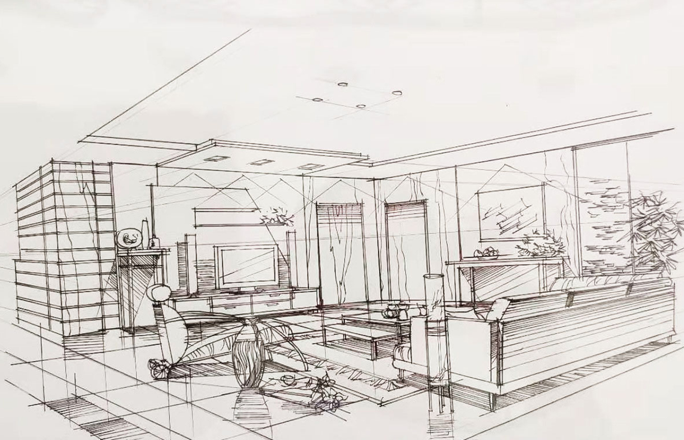 本次课程围绕透视原理与应用展开,侧重环艺专业的建筑与室内空间的透视表现,同学们学到了一点透视、两点透视、三点透视、曲线透视、倾斜透视等多种透视方法。学会了利用三视图表现家具、车辆和产品的表现方法。对室内建筑空间与室外建筑及景观场景等能够以线性透视表现的方法去表现。