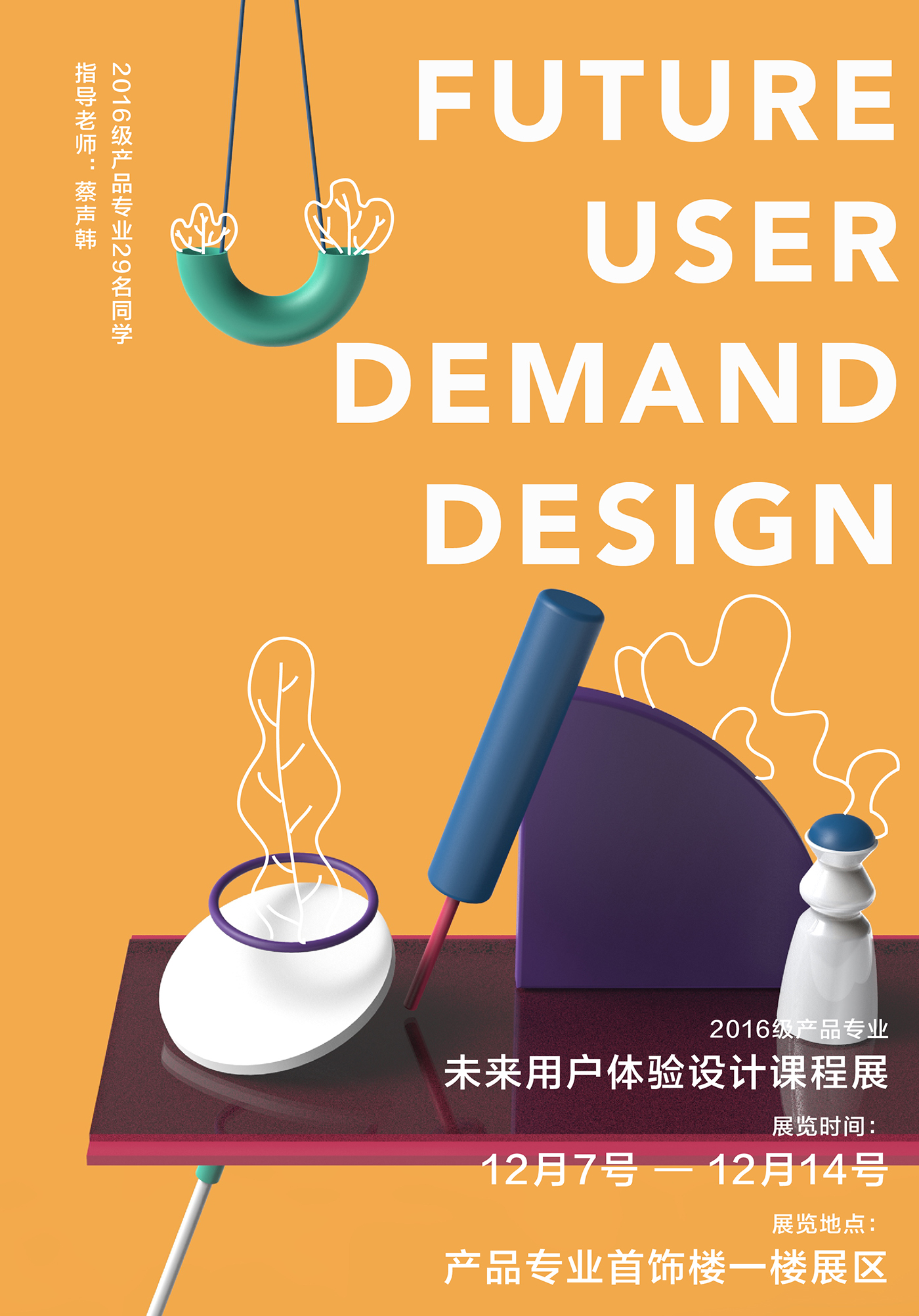 12月7日,耿丹国际设计学院产品设计专业2016级在首饰工作室一层举办“未来用户需求设计”课程展览。本次展览的作品包含29名学生设计并制作的8件小组课程作品,课程指导老师蔡声韩。结课展邀请产品专业教师时晓明、张伟参加。