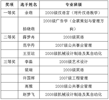 经过激烈的角逐,最终来自2009级对外汉语专业的余萌同学和08级会展策划专业的杨晓萌同学凭借出色的表现荣获一等奖。