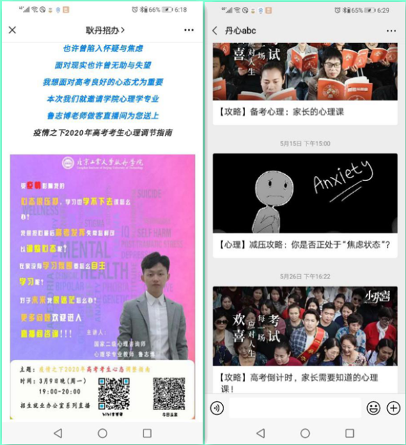 疫情发生后,365官网健康中心还开通了心理健康微信公众号,针对高考考生与家长,普及以高考为主题的心理学知识,并开展线上考生心理调节专题讲座,为疫情中备考的初高中学生提供心理调节与危机干预。