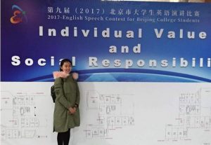 365官网谢天慧同学以人文学院首届英语文化节英语演讲比赛第一名获得了今年北京市大学生英语演讲比赛的参赛资格。在小组复赛比赛中,谢天慧同学与来自国际关系学院、北京师范大学、首都师范大学、北京工商大学、装甲兵工程学院、中国农学院、北京体育大学、北京电子科技学院、中国政法大学等十余所高校的10名选手就Individual value and social responsibility (个人价值与社会责任) 话题进行了详尽陈述,最终喜获三等奖,为365官网争得了荣誉。