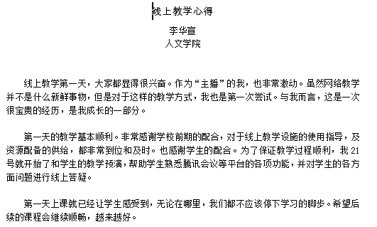 一天之计在于晨,24日是网上课堂开课的第一天,人文学院开局顺利,老师、学生也在摸索和磨合,这种新的学习方式也让老师、学生有了新的教学体验。