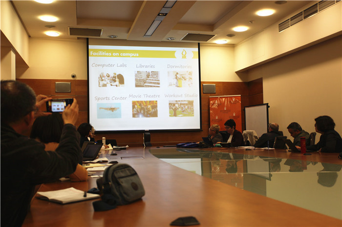 理工学院首先请参访团观看了一个简短的学校宣传片,使用高科技手段展示了学校的发展历程,从1924年开始招收可以选择建筑和土木工程学生,到28年理工大学就有了第一批毕业生。50年代迅速扩张,计算机科学、航空、机器人、自动驾驶和医药等相关专业设立,与摩托罗拉、英特尔等公司的合作研究,诺贝尔奖获得者和教授取得的成绩,到后来开始招收国际学生,海外学院的建立。学校用三维立体和现代媒体技术让人快速了解到这所大学在科技领域的创新和对社会的贡献,也给人以非常震撼的视觉体验。