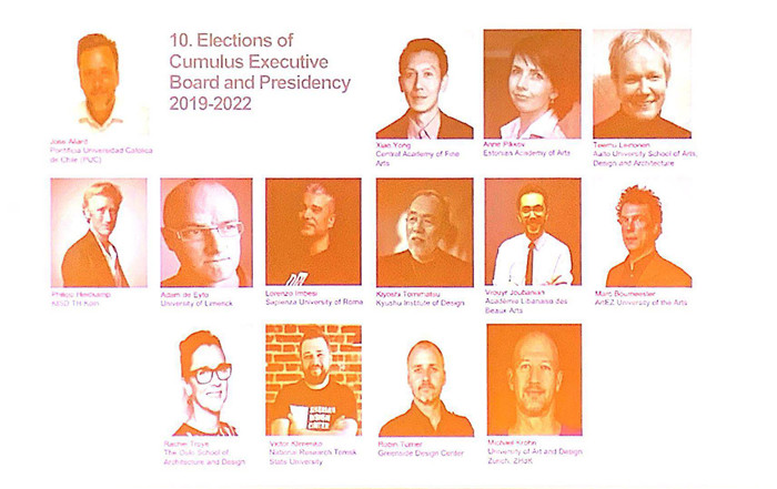 本次竞选分为两轮,每位竞选者有5分钟演讲时间。国际设计学院学术委员会主任肖勇教授经两轮投票,以105票的总票数高票当选新一届Cumulus执行理事会成员,在18名候选人中脱颖而出。这标志着在全球教育平台上中国设计和教育的重要性。