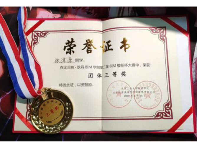 刚上大一的时候,我加入了BIM工作室进行BIM软件的学习,并且和同学们一起报名了校园樱花杯的比赛。因为想要做到更好,我们夜以继日的学习和工作。功夫不负有心人,我们第一次代表建筑学参赛就获得了第三名的成绩,这一切都是团队合作的结果。之后,我又在自己的努力下顺利的考取了一级建模师的资格。这也为我实现梦想奠定了一块基石。