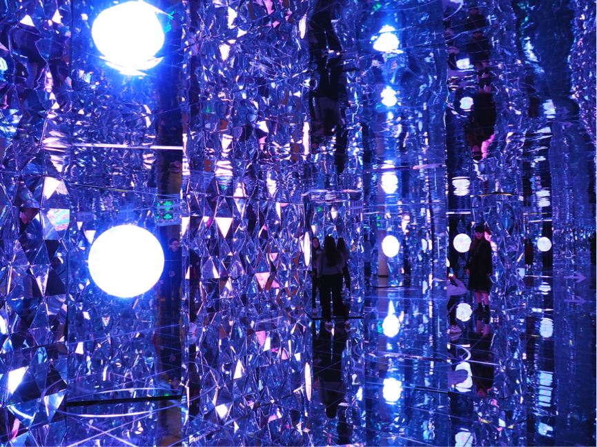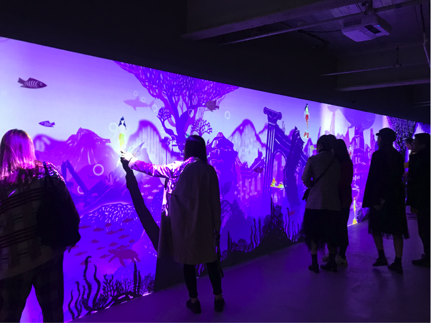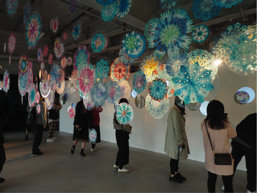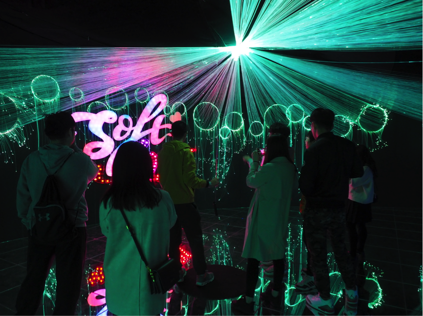 本次展览由中国人民大学创意设计模式创新工作室携手亚洲最具创意的日本BIRDMAN设计团队,在1400平米的艺术空间中,以“Soft Love”为创作核心概念,以传统剪纸文化为创作元素。展览通过内置和运用影像交互装置、雷达体感捕捉设备、投影衍射设备等尖端新媒体技术,通过五大展区浸没式的艺术作品群,在这里,学生依次参观了《一镜一天堂》、《一木一浮生》、《一花一世界》《一云一绯海》以及大型人鱼影像交互装置等作品。现场老师们也为同学们从创意构思与技术的可行性两个方面进行分析,帮助同学们更好地从视觉、触觉、听觉感受沉浸式多维交互体验的技术作品。