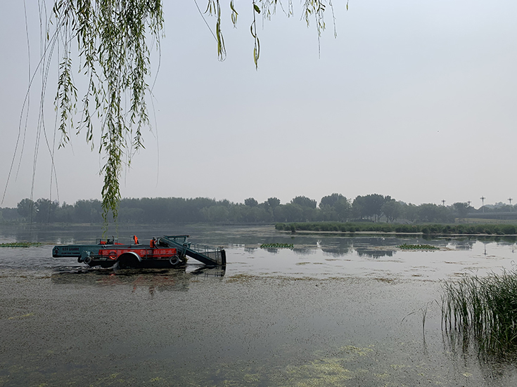 第二天,城规大一全体学生前往减河公园进行调研考察。作为环境管理概论课程的首次校外调研,学生们很有积极性,参与度极高。首先,外教Ken 在潮白河边向学生介绍了河水富养污染的原因及危害,介绍了一些污染成因的历史背景。课程中,正值河道环境整治工作船工作时间,外教Ken实地的向学生们介绍了城市水环境管理的一种常见方式——绿藻浮萍的定期清除。工作船清除绿藻浮萍的目的就是为了减少河水因富养化引起的绿藻污染,从而净化水质,提高河水含氧量和透光性,给水下的生物提供更好的栖息环境。