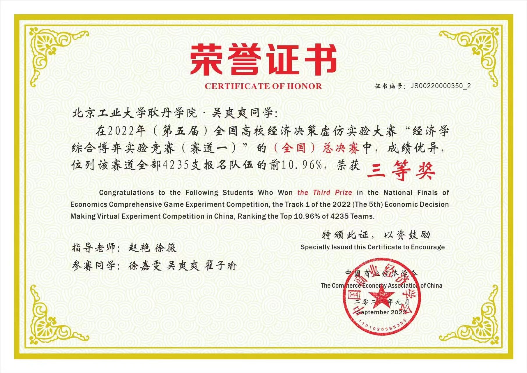 国际经济与贸易专业学生获得2022年(第五届)全国高校经济决策虚仿实验大赛总决赛三等奖