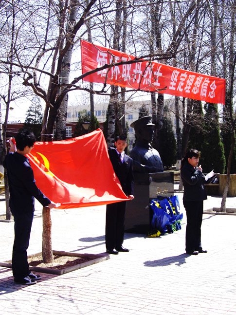 在庄严肃穆的气氛中,主持人张红宁老师宣布活动正式开始。由五位学生代表向耿丹烈士敬献鲜花,全体人员默哀一分钟。郭颖书记、赵靖娜老师、赵梦飞同学分别代表院党总支、教师党员、本期党校学员做了发言。最后王舒蛟副院长带领全体到场人员重温了入党誓词。