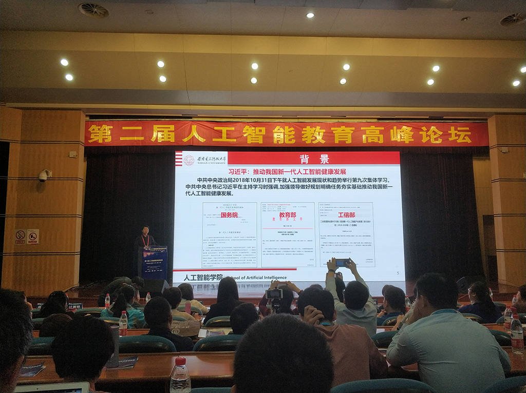 下午的演讲环节分别由桂林电子科技大学原校长古天龙教授、杭州电子科技大学吴卿副校长、南京航空航天大学计算机学院陈松灿教授进行。三位教授分别做了“人工智能时代的数字素养教育”、“地方高校人工智能实践育人体系建设的探索与思考”、“人工智能人才培养模式初探”的主题演讲。尤其是陈松灿教授的演讲幽默而风趣,引发了场内的阵阵笑声。