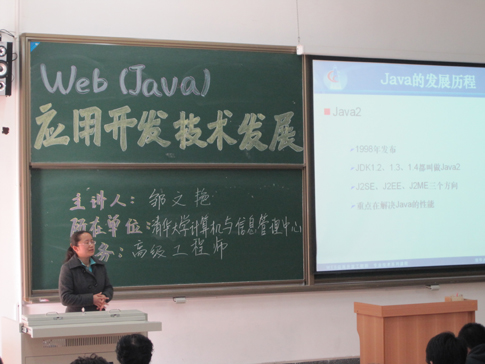 为激发同学们的学习兴趣,促进同学们对Java与Web应用开发技术的深入认识与了解,4月14日下午,信息工程系于举办了“Java与Web应用开发技术的发展”学术讲座。主讲人是清华大学计算机与信息管理中心高级工程师邹文艳老师。