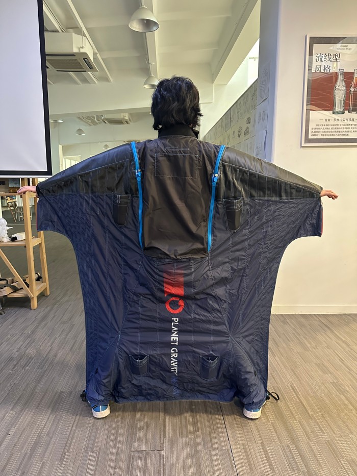 演讲过程中,陈腾博瀚先生通过自己设计的翼装实物,详细讲解了设计细节。演讲结束后,多位同学好奇地试穿了翼装,亲身体验了真实的设计产出,从而加深了对设计的理解。