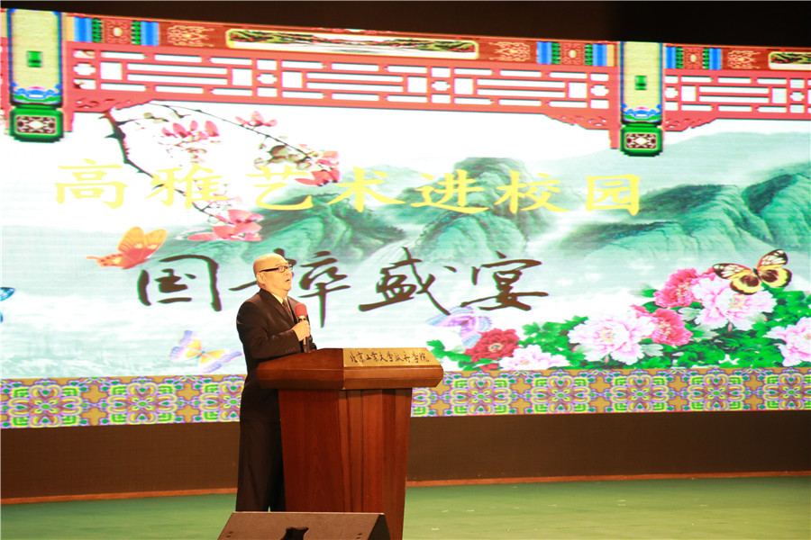 演出正式开始前,国家京剧院一团常务副团长脱志国为在场的观众讲解了京剧知识,让同学们更深入的了解了京剧是国粹,是积淀了民族审美习惯和文化传统的艺术瑰宝。