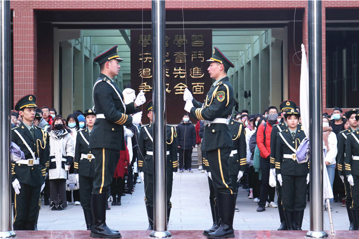 7:20,随着国旗护卫队口令员 ——升旗仪式正式开始!国旗护卫队的队员们不畏严寒,迎着东方的晨曦,怀着赤诚的敬意,迈着整齐的步伐,护卫着五星红旗向国旗台行进,雄壮的《义勇军进行曲》响起,鲜艳的五星红旗冉冉升起、迎风飘扬,全体师生面向国旗行注目礼,同唱国歌,彰显出全体师生对爱国爱党爱校情感的深刻理解和把革命先烈的爱国情怀永远传递下去的决心。