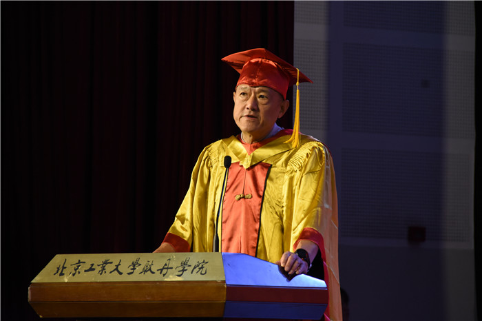 在雄壮的国歌声中,毕业典礼正式开始。院长林炎志首先致辞,林炎志院长祝贺耿丹新一届毕业生顺利毕业走向社会,为中华民族伟大复兴、为实现中国梦贡献青春和力量。他表示,从今天开始,大家将开启全新的人生旅程,有鲜花、也有荆棘,有欣喜、也有艰辛。但是请你们记住,母校永远是你们的大后方,与你们风雨同路,给你们家的支持和温暖。林炎志院长指出,读大学时期是我们一生中最自由的时候,但是这是一种初级自由。将来你会在社会上打拼,通过自己的努力一个台阶一个台阶的去奋斗,这样的自由就是一种高级的自由。林炎志院长中希望耿丹学子要具有“天将降大任于斯人也”的决心和勇气,去开拓出人生的一片天地。