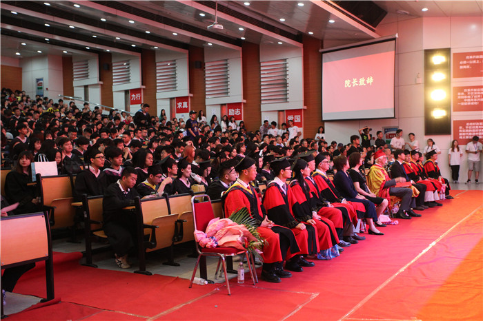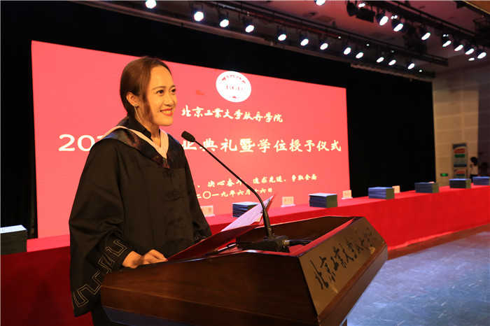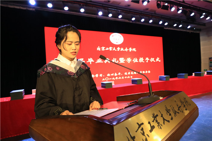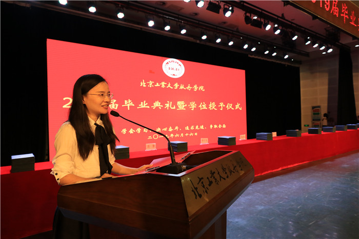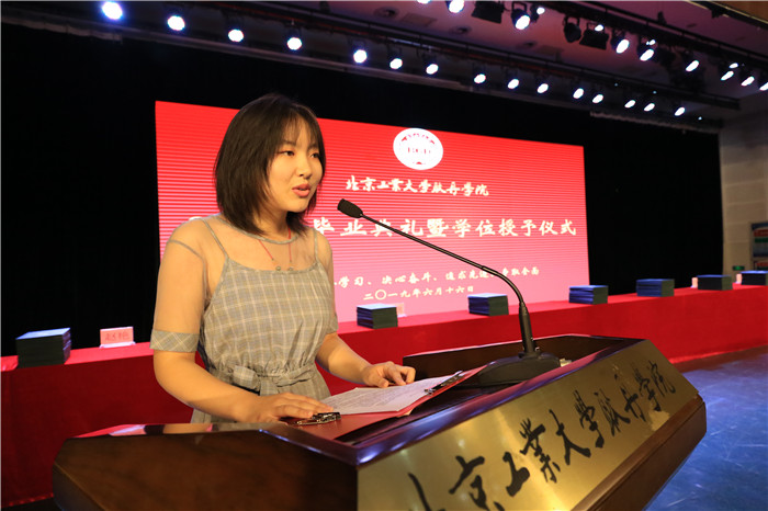 在校生代表财务管理2016级学生于梦涛,工程管理2017级学生唐依玲在发言中表达了对即将毕业的学长们的依依不舍之情,表示后来的耿丹学子将会接过历史的接力棒,提高自身的综合素质,在奋斗中释放青春激情,成就人生梦想,为耿丹争光。