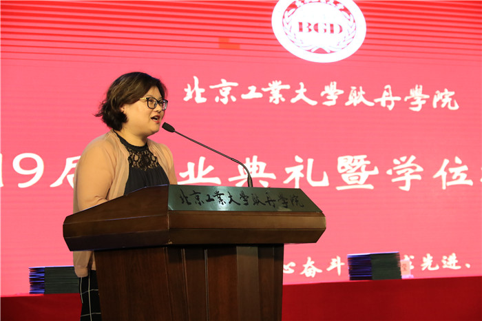国际商学院单文博老师,国际设计学院李靓老师分别代表全校教师在毕业典礼上发言,他们在发言中向圆满完成学业的优秀学子表示衷心祝贺,希望2019届耿丹学子在走出校园,走向社会,感恩母校,报效祖国。
