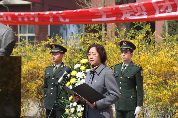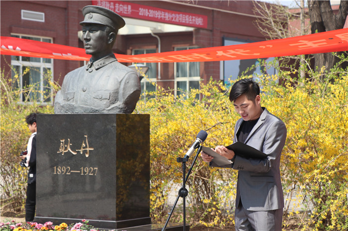 中午12点20分,主题团日活动在庄严的国歌中拉开帷幕,齐唱国歌振奋着每一位团员青年;接下来由团员代表王继凯同学介绍了耿丹烈士生平并宣读祭文,与会师生用默哀形式来缅怀革命先烈的丰功伟绩,寄托对革命先烈的无限哀思。默哀毕,国旗班同学们身着整齐戎装,踏着铿锵的步伐,向烈士敬献花篮,师生代表向烈士敬献鲜花。